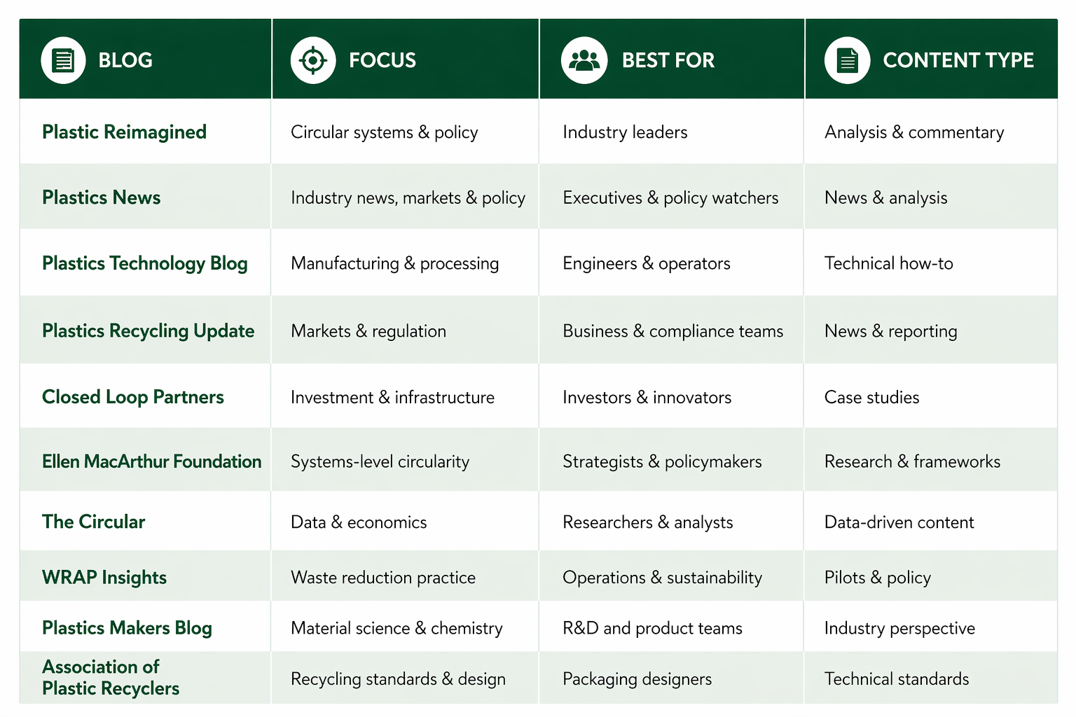 How we selected these blogs: This list was curated by the Plastic Reimagined editorial team based on publication frequency, industry credibility, depth of coverage, and relevance to circular economy practitioners. It was last reviewed in April 2026.